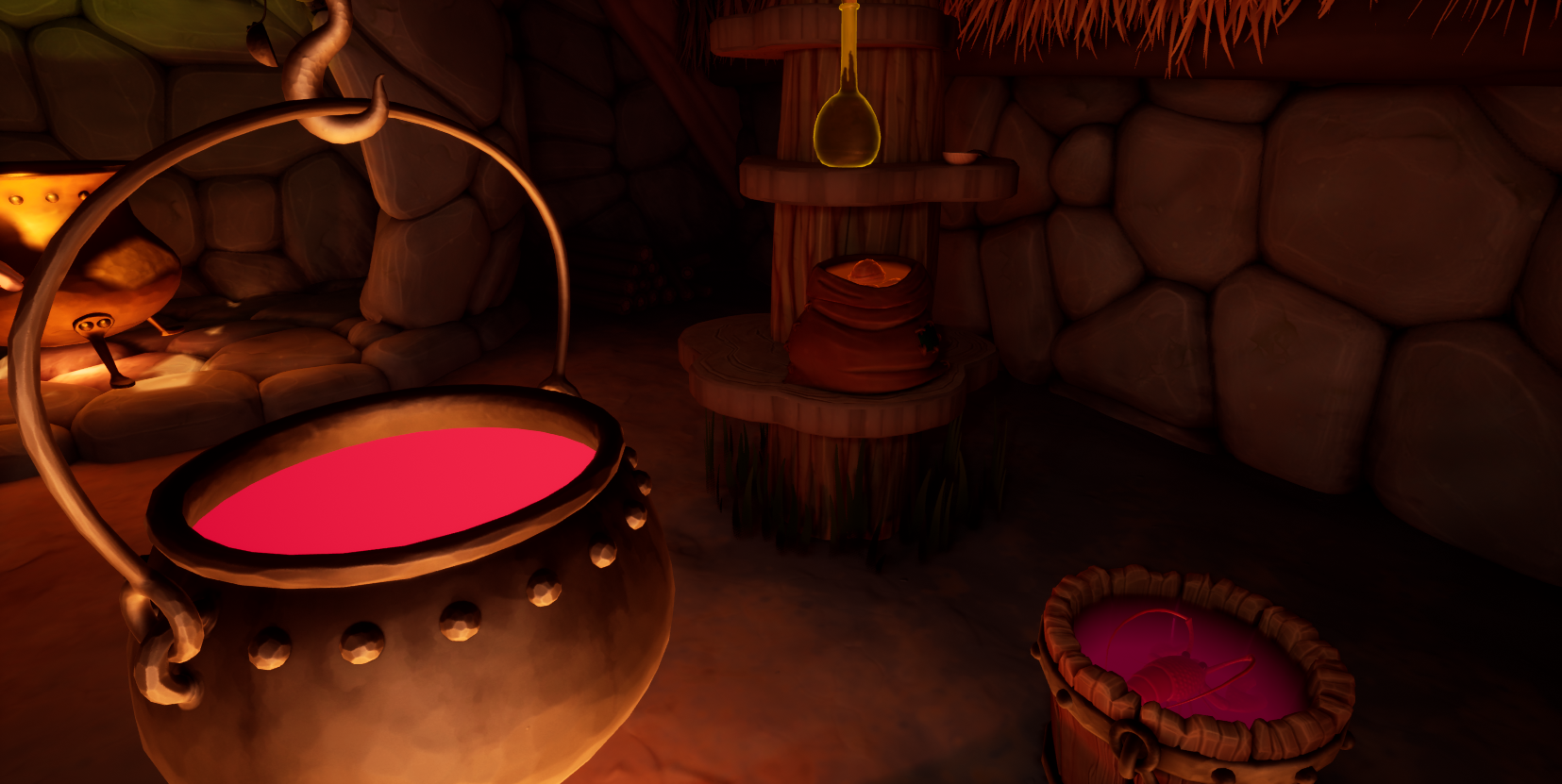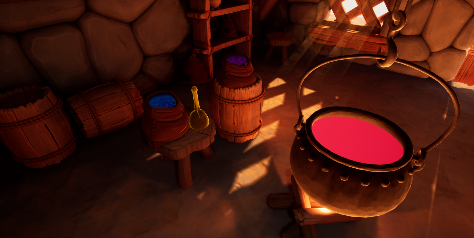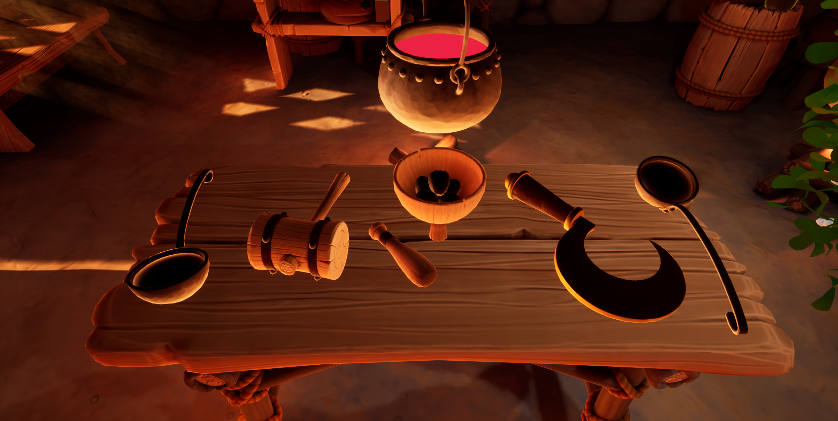 Players must concoct potions (magical but not excessively so) using various ingredients and utensils. I had to develop all these mechanics, such as allowing players to place an ingredient in a bowl, crush it with a pestle, and then pour its contents. Additionally, I implemented mechanics for opening a nut with a mallet and simply tossing an ingredient into the cauldron. I also handled event management, such as detecting objects falling into the cauldron. If the object is an ingredient, the system checks whether it matches the recipe requirements.