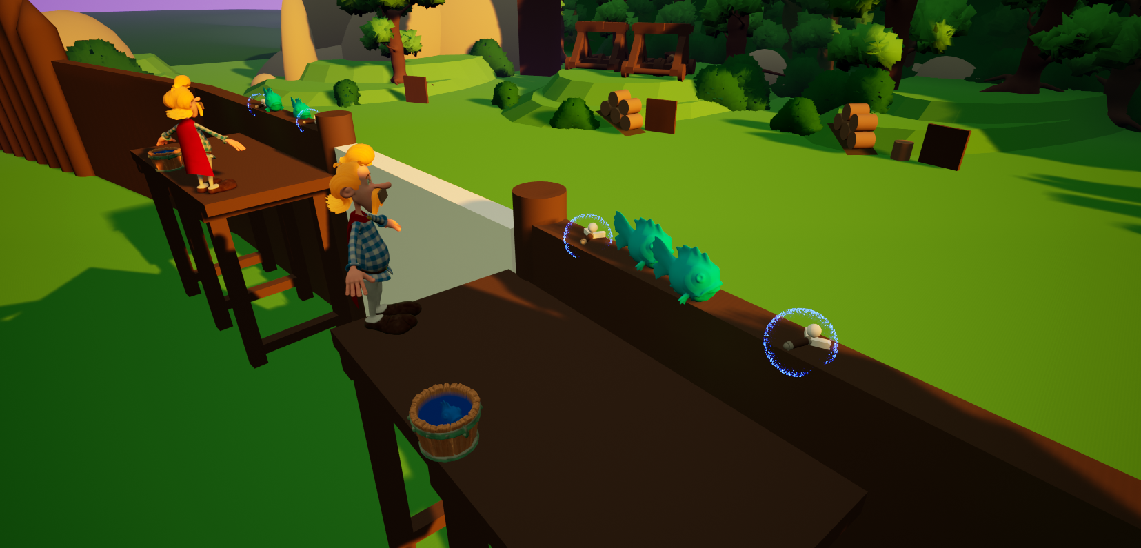 Working on virtual reality presented unique challenges. Since most actions require physical interaction from the player, it was crucial to prioritize the user experience. We had to avoid abrupt character movements to prevent motion sickness among sensitive players. For instance, in one level, we traverse a forest using fast-moving platforms, and extensive testing revealed that this could cause discomfort. We also faced constraints related to player movement and playable space. In the potion preparation level, we had many ingredients but limited space, so we decided that each player would have certain ingredients and would need to communicate with others to obtain the rest.